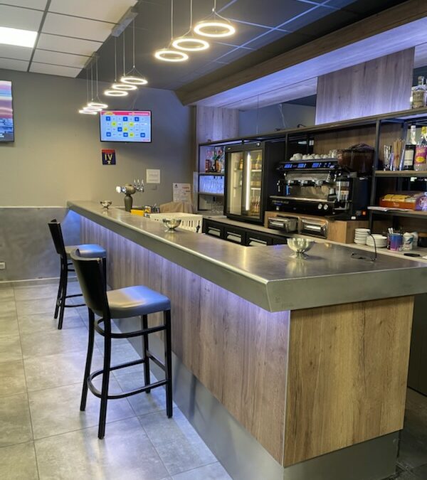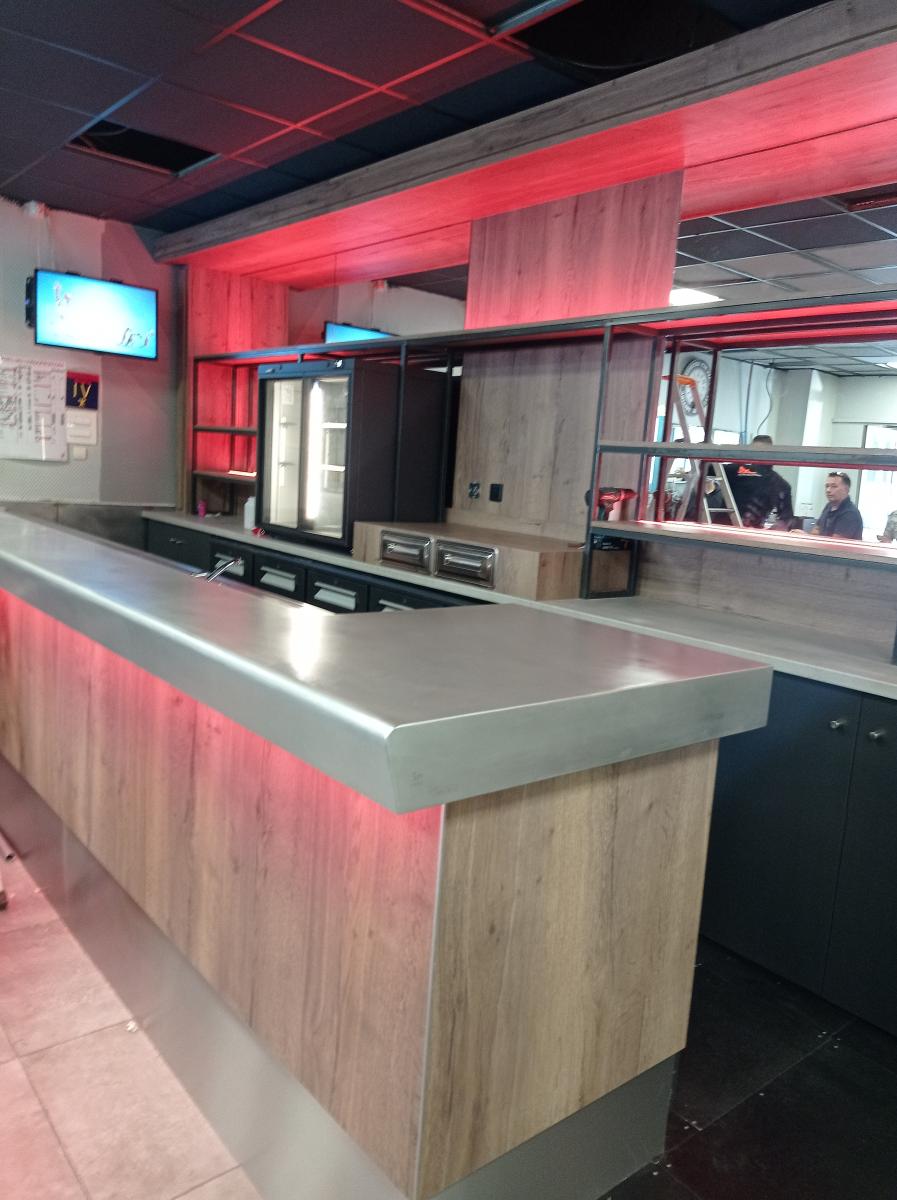 Le projet : Pour cet établissement très fréquenté du sud de la France, nous avons crées un veritable outil de travail avec une plonge inox et surtout un très beau plateau de bar en étain de l'"Atelier du Comptoir en Etain". Le tout agrémenté de rubans de leds en changement de couleur.