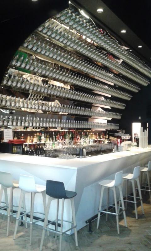 Le projet : Création de deux comptoirs pour cet établissement du centre de Lyon, avec postes cocktails sur mesure tout inox, comptoirs en résine, arrière bar en granite, podium à bouteilles lumineux, meuble froid lumineux, ...