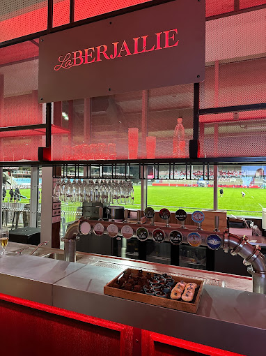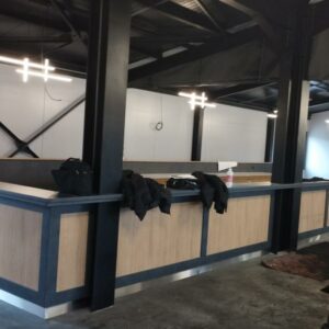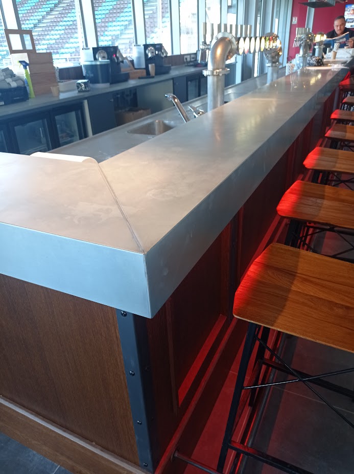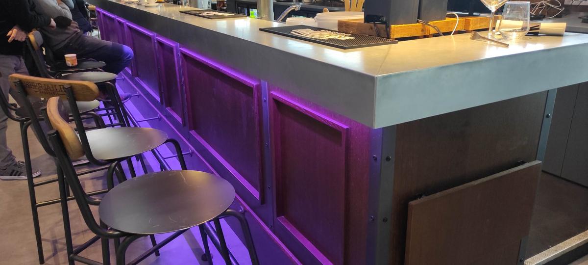Le projet : Dans sa nouvelle tribune, le stade Pierre Rajon à installé une belle brasserie pour accueillir du monde toute la semaine et aussi pendant les matchs. Ici, nous avons installés des étagères suspendues à la charpente, un comptoir en chêne et une piste de bar en zinc. L'intérieur est en inox.