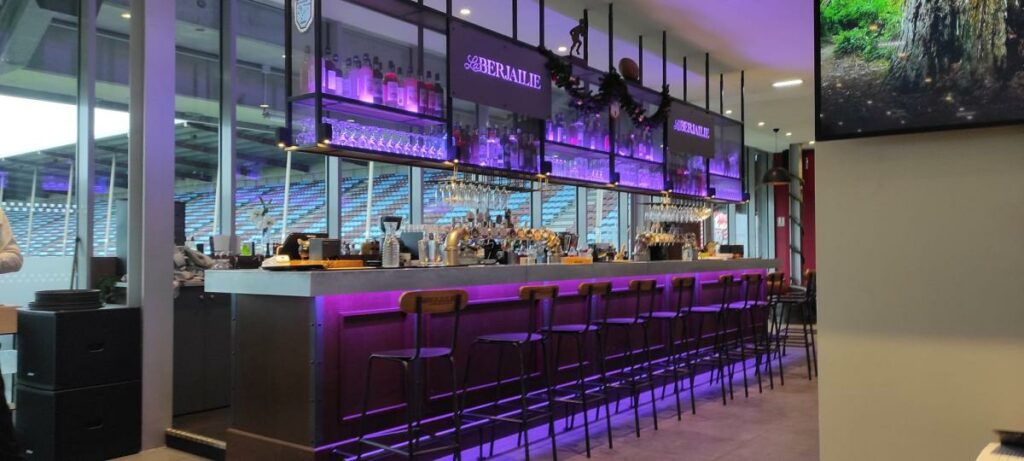 Le projet : Dans sa nouvelle tribune, le stade Pierre Rajon à installé une belle brasserie pour accueillir du monde toute la semaine et aussi pendant les matchs. Ici, nous avons installés des étagères suspendues à la charpente, un comptoir en chêne et une piste de bar en zinc. L'intérieur est en inox.