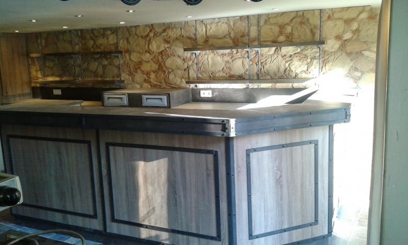 Le comptoir bar mélange un coté béton ciré et une structure métallique.