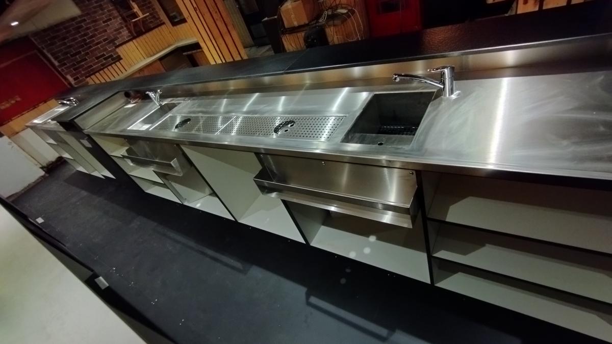 Un coin préparation avec 2 postes cocktails, une grande tireuse à bière et un coin retour laverie.