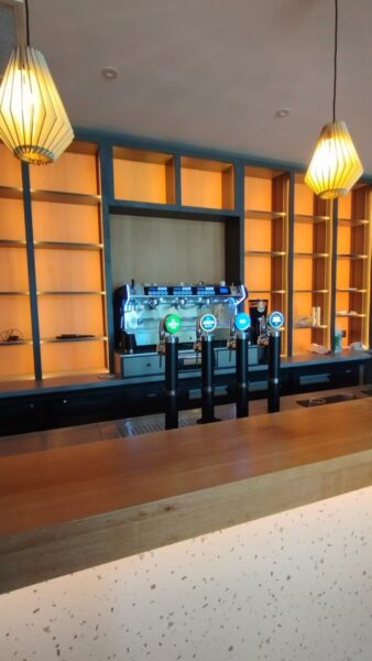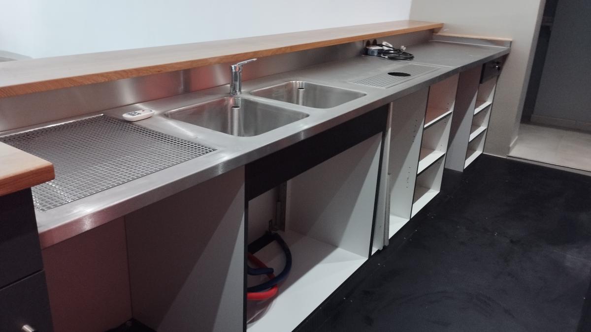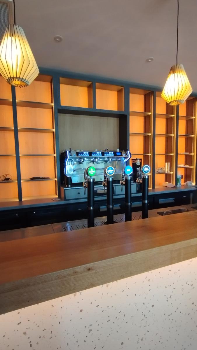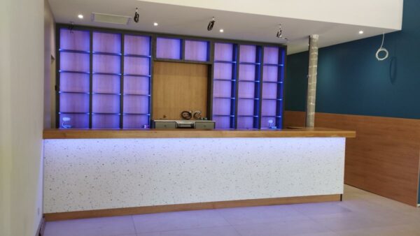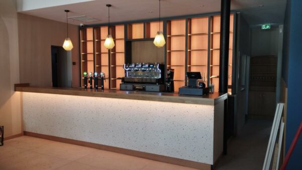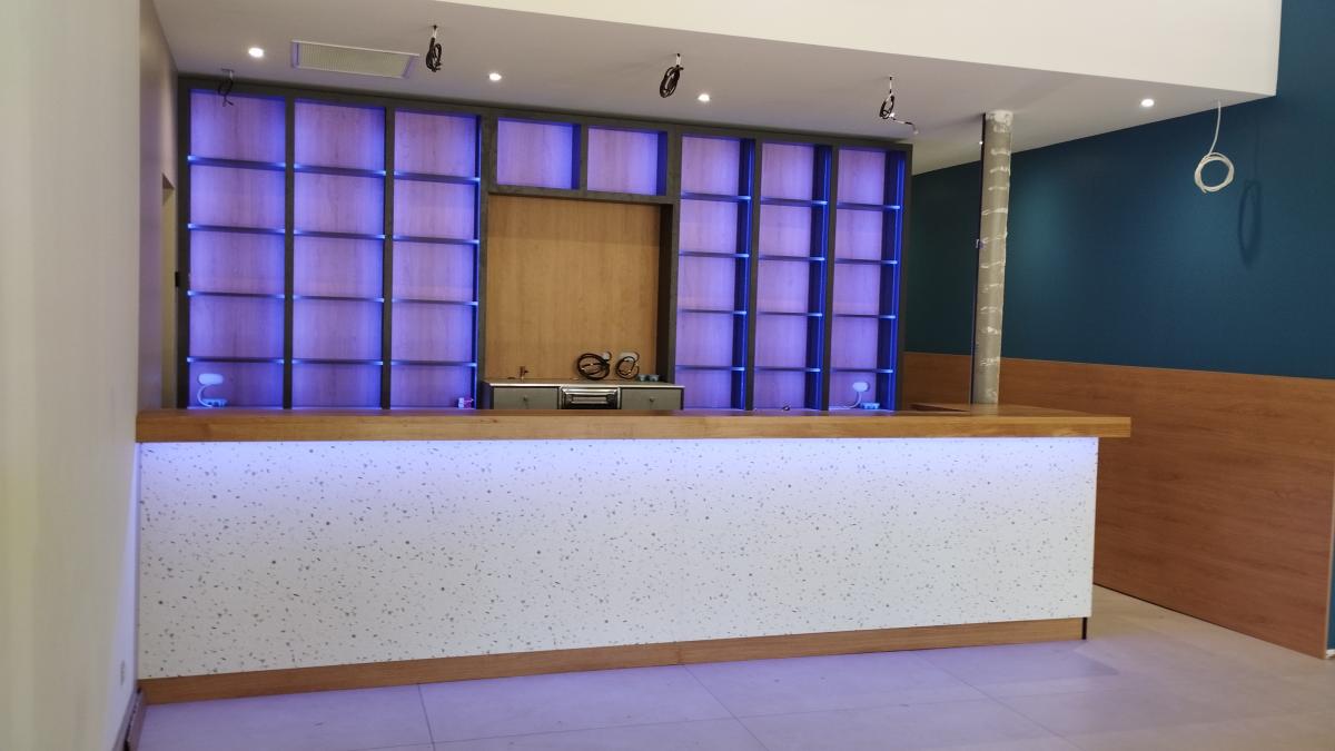 Création d'un comptoir avec façade en stratifié Terrazzo de chez Polyrey et un arrière bar très lumineux.
