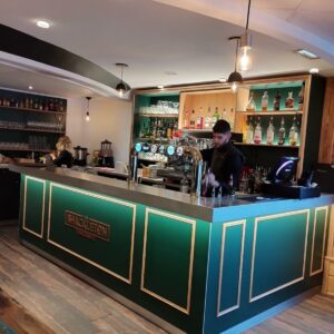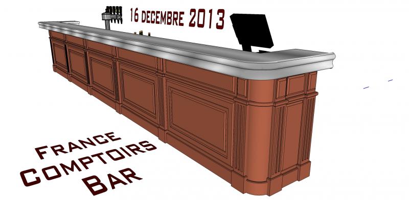 Le comptoir comporte une facade travaillée, un plateau en étain et une barre repose pied.