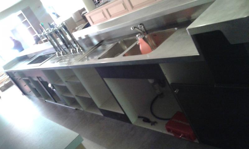 Coté serveur, une plonge en inox sur mesure, avec bac refrigérée de 1,2 metre pour boissons, rince-verre soudé affleur, eviers et dosserts.