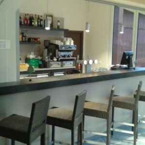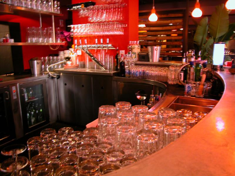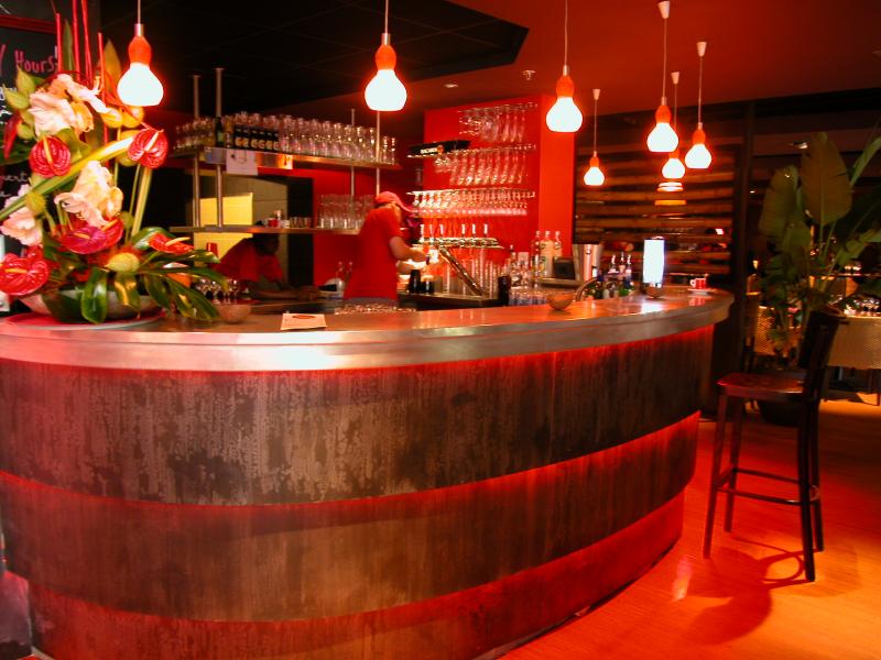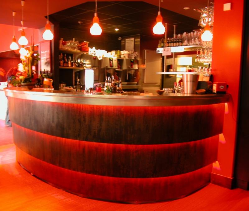Le projet : Comptoir bar arrondi avec plateau étain, vitré traversant à l'arrière.