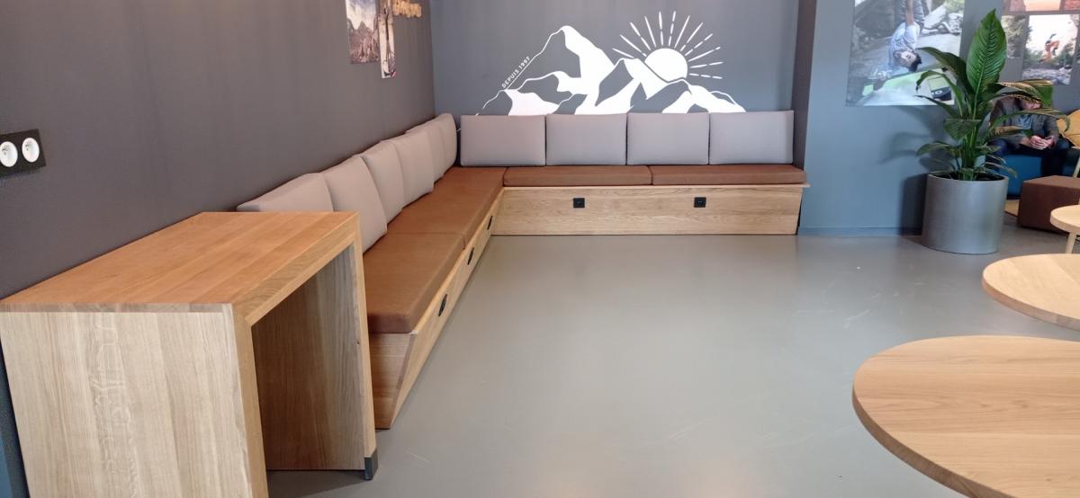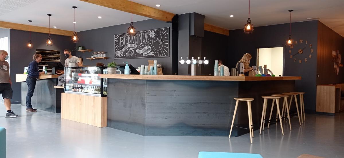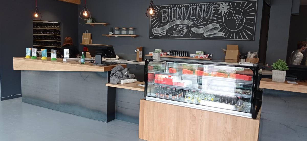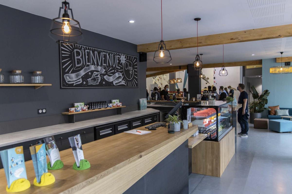 Le projet : Belle salle d'escalade dans le centre de Caen, avec façade en tôle d'acier brute et plateaux en chêne massif.