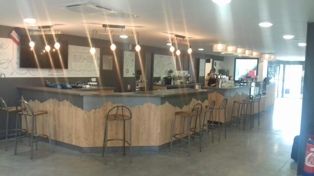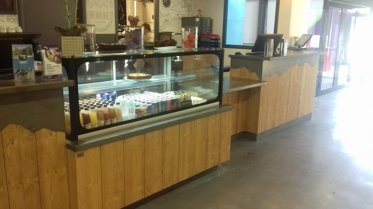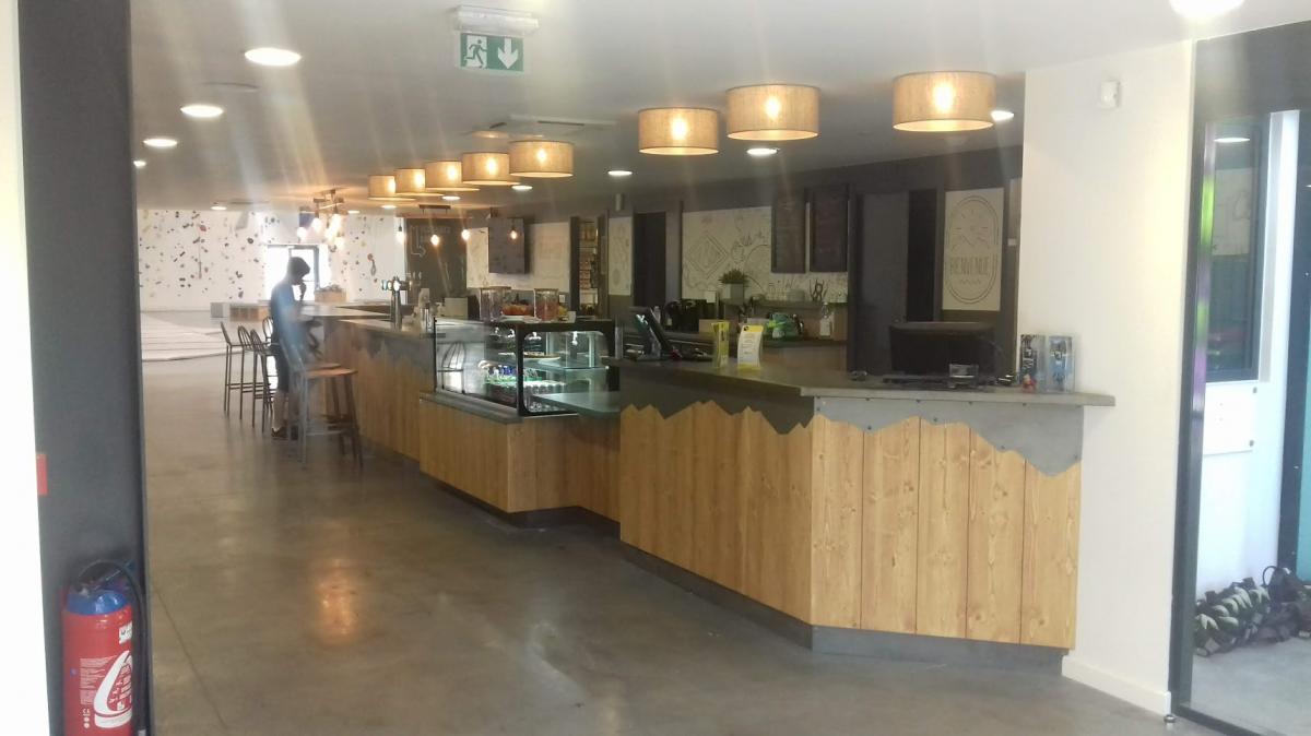 Le projet : Pour la création d'une salle d'ecalade près de Bordeaux, nous avons imaginés un comptoir d'accueil suffisament grand pour accueillir 3 postes informatiques, mais également un coin restauration avec vitrine et tireuse à bière.
